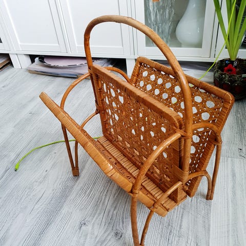 Mycket fin och välbevarad vintage hylla i rotting med elegant bågformad topp. Typisk skandinavisk design från 1940–1950-tal, med gediget hantverk och vacker naturlig patina.