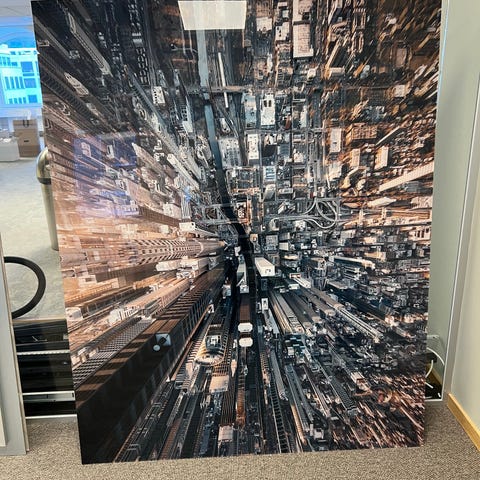 Fotografi av en spiralltrappa med betongtrappsteg och vitt räcke. Bilden visar en vy uppifrån med en svart dörr synlig i bakgrunden. Passar som dekorativ konst för väggupphängning.