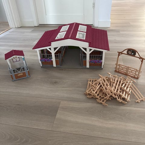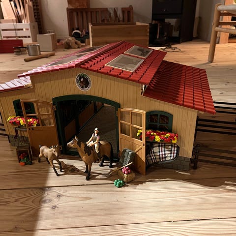 Schleich Häststall och tillbehör leksak med olika hästar, figurer och utrustning. Inkluderar stallbyggnad, hästtransportfordon, ridredskap och diverse tillbehör för lek och samling.