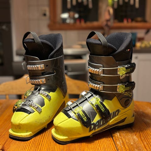 Välvårdade Dalbello Ski Avanti 50 alpinpjäxor i blå och gul färg, mondopoint 25.5 (ca strl 39, 255mm innermått). Smal läst.