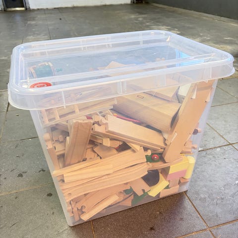BRIO träjärnväg med olika tåg, rälsdelar och tillbehör i trä.
