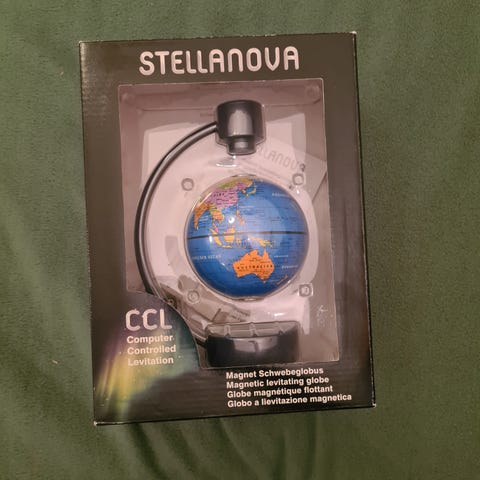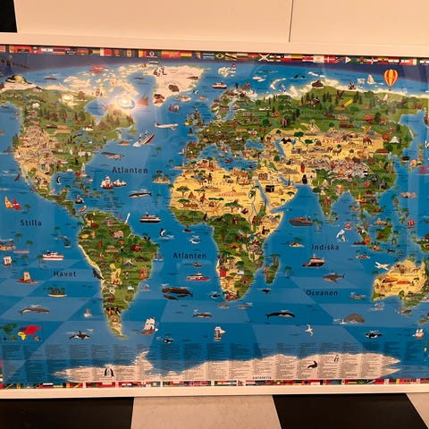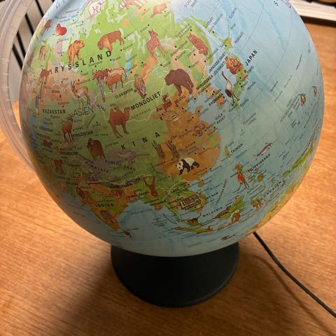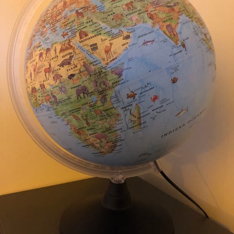 Jordglob 30 cm i diameter med belysning. Fot i svart plast och meridian i frostad plast. Illustrerad kartbild som visar djur och kända landmärken. Svensk text. Höjd med fot ca 45 cm.
