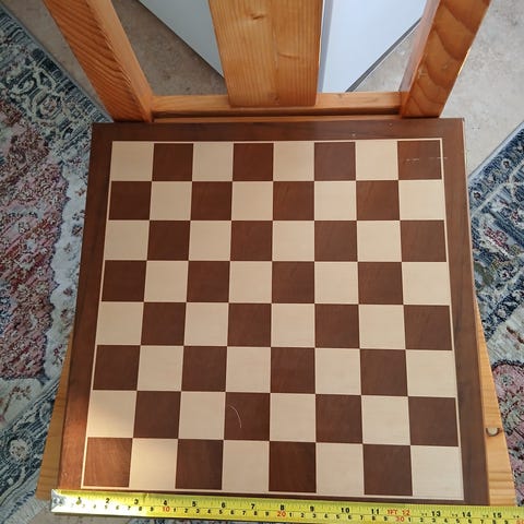 Handgjord schackbräda i marmor med rutor i vit och brun nyans. Schackpjäser i alabaster i två färger, ljus och mörk brun. Brädan är kvadratisk 37 cm, och pjäserna är klassiskt utformade. Passar för schackspel och dekoration. Små skavanker på bordet samt två torn. Se bilder.