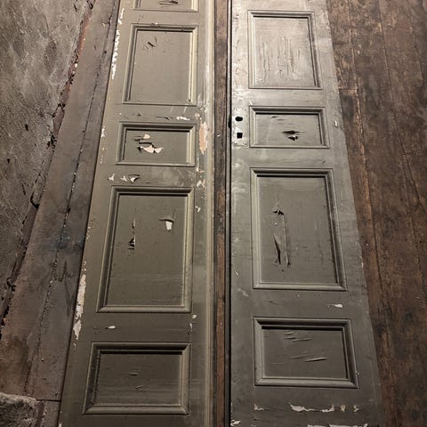 Två gamla trädörrar innerdörrar pardörr i grå färg med slitet och flagnande målararbete. Dörrarna har panelindelning 5 x 2 fält och är av traditionell sekelskifte design. Ca 1890-tal. Kärnvirke så mycket tunga och gedigna. Passar för renovering eller dekorativa ändamål.