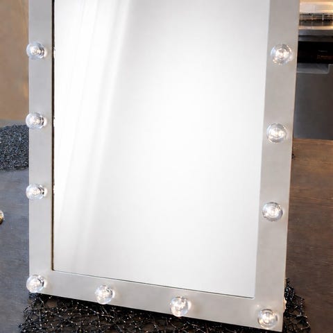 Dekorativ spegel i Hollywoodstil som lyser med ett mjukt sken. Sminkspegeln har inbyggd LED-belysning och är lättplacerad då den kan drivas med batterier. Den kan hängas på väggen eller placeras stående med hjälp av stödet som finns på baksidan.