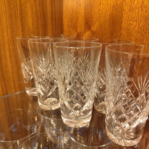 Nio stycken assietter cirka 15cm i diameter. Tolv stycken glas där sju stycken har ett mönster, fyra med ett annat och ett glas med ett annat. Hämtas i Hedesunda.