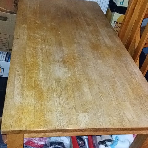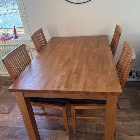 Säljer ett ekbord med 6 st. solar. Allt i massiv ek. Det finns lite skador och skavanker (se bilder) men bordet och stolarna är stabila.