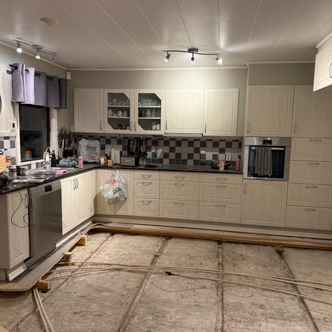 köksstommar med luckor och bänkskiva+ diskho & blandare, stommar i massivt trä, luckor av hög kvalite, övre hörn delen har en hörnförvaring, skafferi bredvid stommen för inbyggnad av ugn och micro.