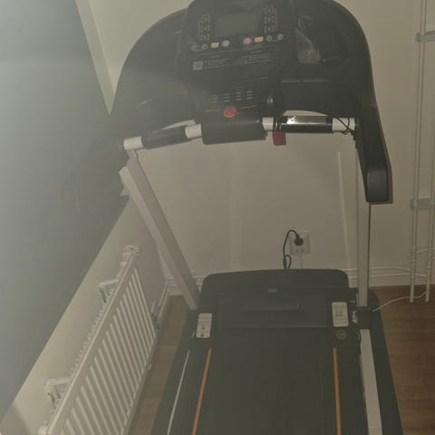 Trekrunner Löpband i röd färg. Utrustad med kontrollpanel för justering av hastighet och andra funktioner. Passar för inomhusträning.