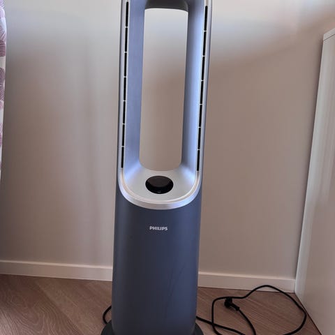 fläkt och luftrenare i vit färg. Utrustad med digital display och kontrollpanel för justering av inställningar. Designad för att cirkulera och rena luften i rummet.