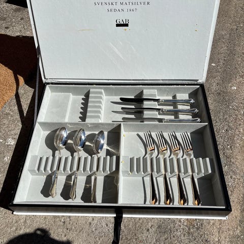 Exclusive Line bestickset i rostfritt stål. Setet innehåller ett komplett urval av bestick för olika ändamål, förvarade i en praktisk resväska med mönster. Designen är enkel och funktionell, lämplig för daglig användning och olika matbordssituationer.