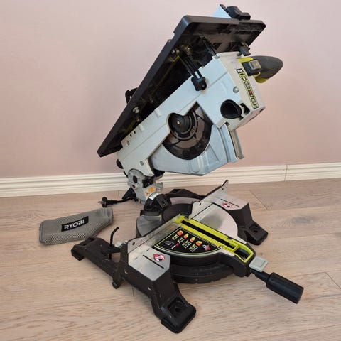 Ryobi RTMS1800 kap- och geringssåg med en effekt på 1800W och en hastighet på 4800 varv per minut. Sågen är utrustad med en justerbar arbetsyta och är avsedd för kapning och geringssågning av trä och andra material.
