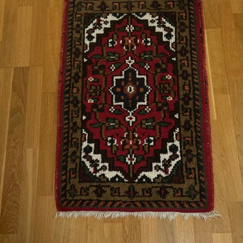 Ullmatta med mörk basfärg och färgglada mönster i beige, rött och grönt. Mattan har fransar på kortsidorna och passar bra i alla rum.