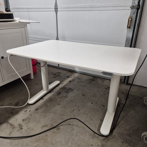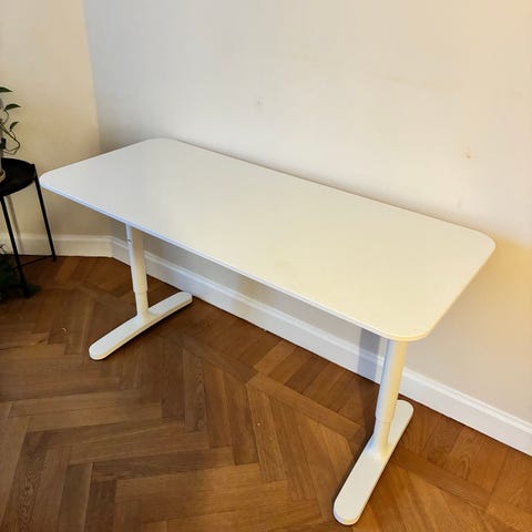 IKEA skrivbord med justerbar höjd. Bordsskiva i ekfanér och ben i vitt.