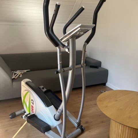 Crosstrainer i vit färg. Träningsmaskin för konditionsträning med digital display för tid, hastighet och distans. Handtag med pulsmätare och justerbar motståndsnivå. Stabil konstruktion för hemmabruk.