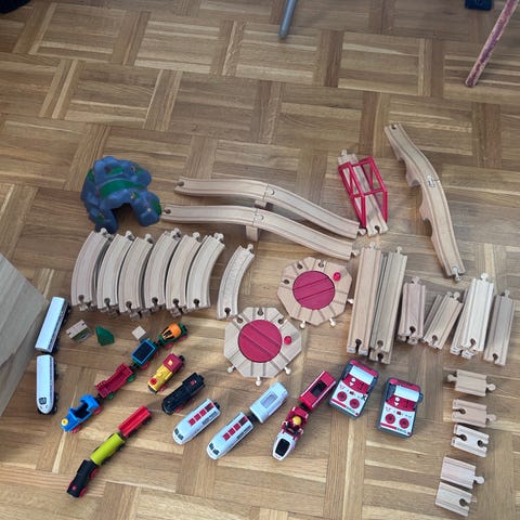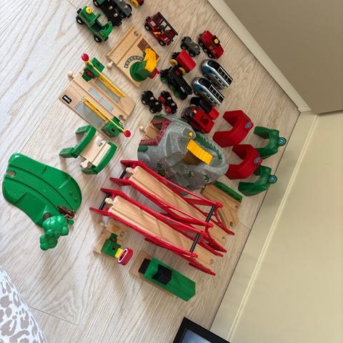 BRIO tågbana set i trä som innehåller olika spårbitar, tåg och tillbehör. Setet inkluderar raka och böjda spår, broar, tåg med flera vagnar, samt station och andra detaljer.