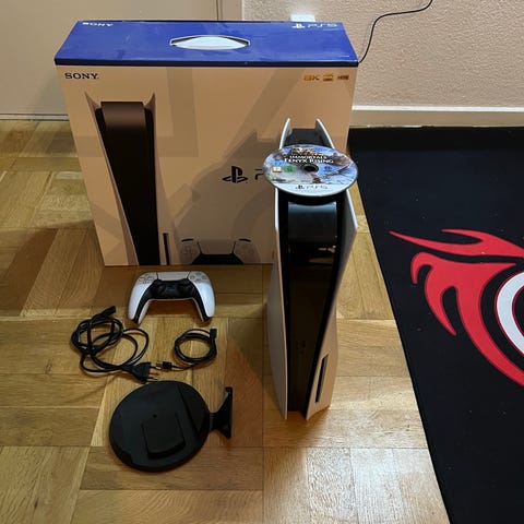 Säljes: En Playstation 5 spelkonsol Disc Edition med vit och svart design. Inkluderar trådlös handkontroll och ett spel (Hogwarts Legacy) samt nödvändiga kablar. Passar för spel på Playstation 5 plattformen.