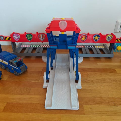 Paw Patrol leksaksfordon i olika modeller och storlekar med Rubble. En grävmaskin, en jeep och en mindre lastbil. Leksakerna är gjorda av plast och är anpassade för barn.