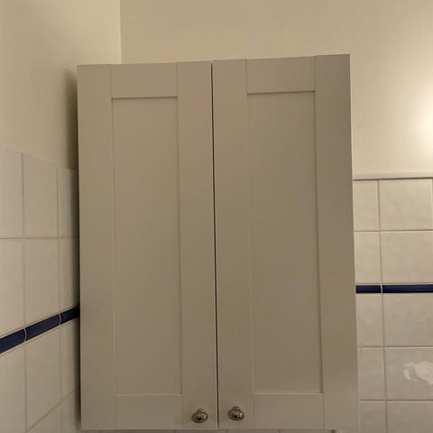 Vit badrumsskåp med frostad glasdörr och hyllor