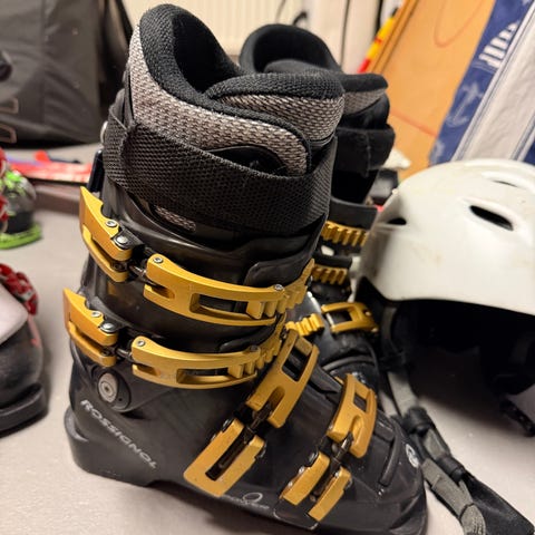 Slalompjäxor dam storlek ca 39 (25,5). Skidorna mätte jag till 158cm cirka.