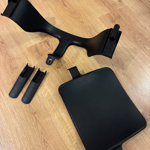 Stokke barnstol i vitt material. Passar för barn och används som sittmöbel vid matbord eller liknande.