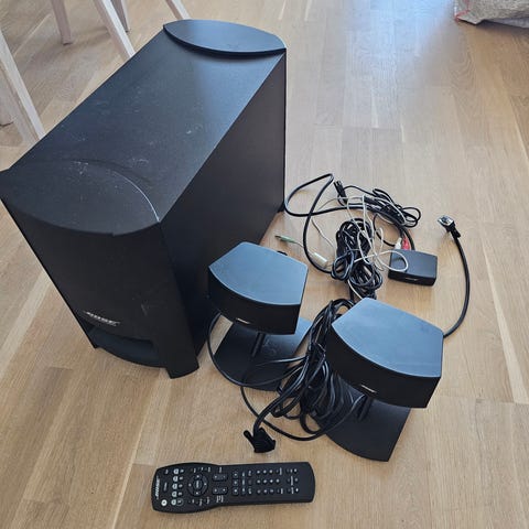 Panasonic SA-PM250 microanläggning med två högtalare och fjärrkontroll. Enheten har en kompakt design och är avsedd för ljuduppspelning i mindre utrymmen.