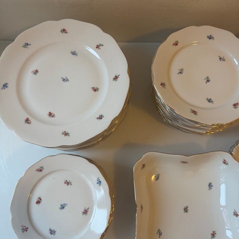 En vacker servis med förgyld kant från Haas & czjzek Schlaggenwald. Tyvärr har den en liten spricka i en av de små assietterna men annars i fint skick. Assietten går fortfarande att använda.