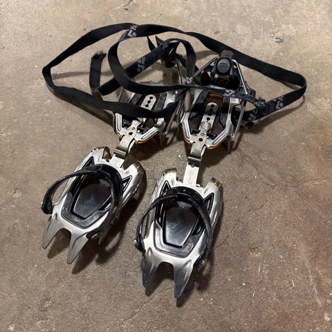 Black Diamond Crampon stegjärn i orange och svart färg. Används för att ge bättre grepp vid vandring eller klättring på is och snö. Utrustade med remmar och metallspännen för fastsättning på kängor.