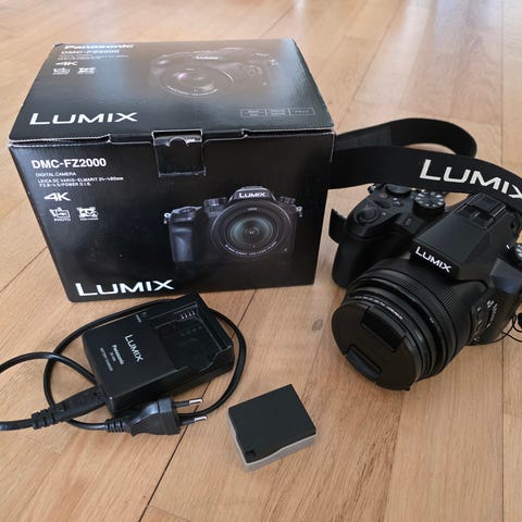Panasonic Lumix digitalkamera i svart färg. Kompakt design med inbyggd objektiv och mått anpassade för bärbarhet. Kameran är avsedd för allmän fotografering.