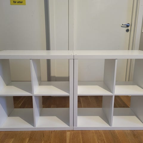 Vit kalax-hyllamed 8 fack. Några märken från ”tassar” samt klistermärken på ena sidan som enkelt kan tas bort, annars mycket fint skick.