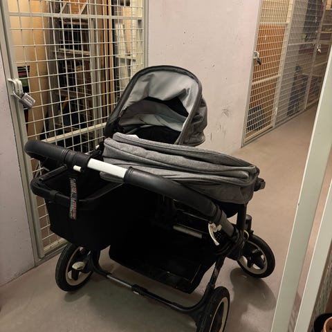 Bugaboo Donkey 3 för två barn i grå färg. Vagnen är utformad för att kunna användas av två barn samtidigt med separata sittdelar och liggdel. Den har en robust ram och hjul anpassade för olika underlag. Passar för barn i olika åldrar och erbjuder flexibilitet i användning.