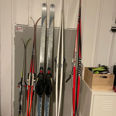 Ex Elit Sport 110 längdskidor med tillhörande stavar och bindningar. Skidorna är utrustade med remmar för säker fastsättning.