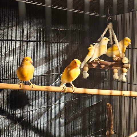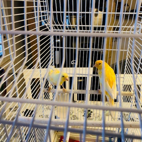 Hej. Säljer våra kanariefåglar då omständigheter gör att jag inte har samma tid för dom. De är en hane och hona. De är 18 och 16 månader gamla. Hanen är mer social än honan och sitter gärna bredvid och tittar på vad man gör och sitter lugnt kvar i buren och tittar på när man fixar där. Honan är nyfiken men sitter ofta på lite längre håll. De svarar när man pratar med dom och tycker om att vara nära. De är vana vid att buren står öppen under dagtid så de kan gå in och ut som de själva vill. Buren är 80×80×55. De är vana vid att vi byter inredning i buren vv månad ca så de blir nytt. Vi har sått kattgräs till dom och de får dagligen grönsaker eller frukter. De gillar inte pellets men äter fröblandning för kanarie fåglar. De har ett badkar med vatten och ett med sand. Jag är väldigt mån om vart de hamnar och att de får fortsätta att ha ett bra liv. De har inte haft några ungar och jag vill inte de endast ska leva som avels fåglar och få ungar hela tiden eller att man särar på dom.