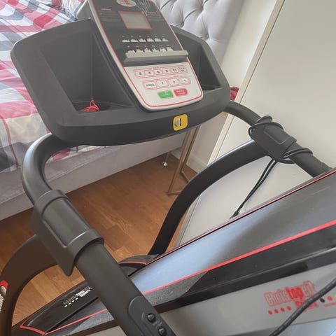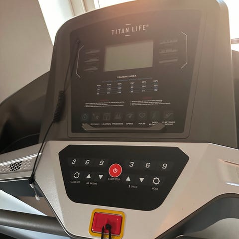 Titan Fitness Treadmill löpband med display för hastighet, lutning och program. Svart och blå färg. Utrustad med olika lutningsnivåer och hastighetsinställningar för varierad träning.