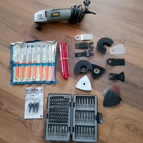 Diverse verktyg enligt bilder, en hel del nytt: Popnittång lite kraftigare, med flera munstycken och lite blindnit, skarvsladd jordad 3 m, liten lampa, brytbladsknivar, skruvhandtag med bits samt nedräkningstimer.