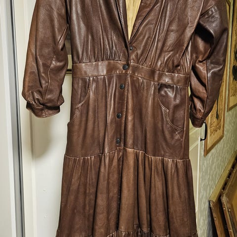 Ett elegant dräkt i mjukt älgskinn. Jackan har en unik design med ett rutmönster på fram- och baksidan, puffärmar och en figursydd passform med en liten peplum. Kjolen är en A-linjeformad modell (fiskstjärt) med stråveck och dekorativa sömmar och en bekväm längd. Storlek 38. Dräkten endast använd ett fåtal gånger.