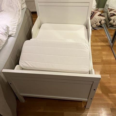 Den här 10 cm tjocka och 3-delade madrassen växer i takt med ditt barn och den utdragbara sängen. Vändbar med 2 olika ytor – den ena sidan är äggformad och mediumfast, den andra slät och fastare. från Ikea.