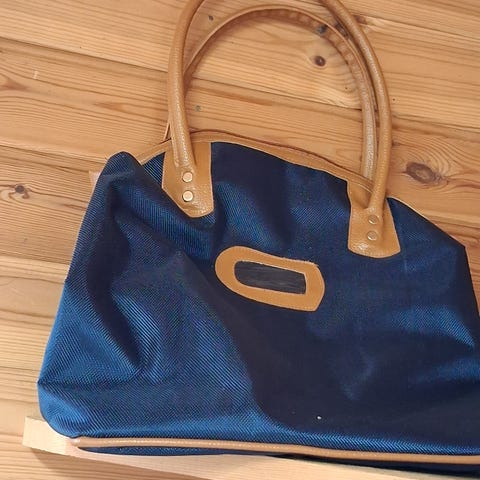 Vintage bag / Arbetarväska, tror den är från 1960-talet. Höjd 42cm bredd 32-38cm. Blivit lite hård. Dragkedjan fungerar. Finns hål uppe i tre hörn, se bilder. Handtagsfästena behöver sys. Även dragkedjans söm har lossnat på ett ställe.