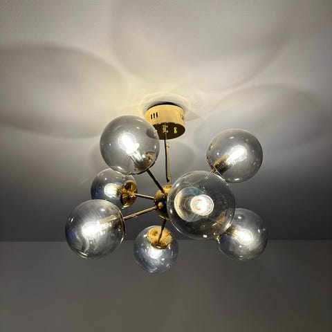 En stilren och elegant taklampa i guld med nio glaskupor. Lampan ger ett mycket bra och behagligt ljussken som passar perfekt över matbord, i vardagsrum eller större hall.