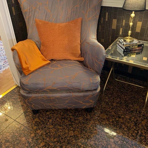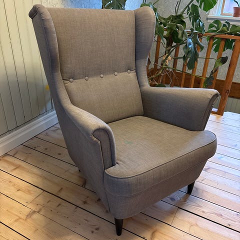 Sällsynt, grå öronlappsfåtölj "Tommarp" från Ikea. Liten maska som gått på hörnet av sittdynan (knappt synligt) och liten fläck på ryggen - annars superfint skick.