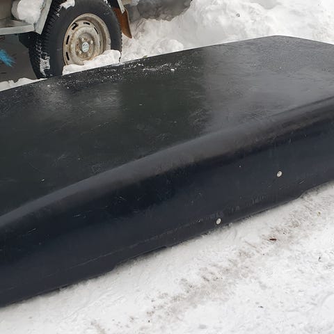 Något skadad takbox. Längd 220cm, bredd 90cm, höjd 35cm. Fästen för lasthållare medföljer.