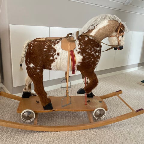 Gungande häst i form av ett mjukdjur med grå kropp och vit man. Utrustad med sadel och tyglar. Passar för barn som leksak och inredningsdetalj.