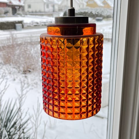 Knoppar i bärnsten glas med mässingsfot. 60/70-tal. Fint skick. Märkta Verrina Sweden.
