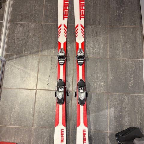 Komplett skidpaket med skidor, pjäxor och stavar.