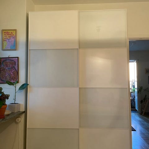 PAX garderob med skjutdörrar, mått 200x60x236 cm. Finns en skada på insidan (se bild) som man lätt kan dölja med hängande kläder. Medföljer ett extra hyllplan som inte är med på bild.