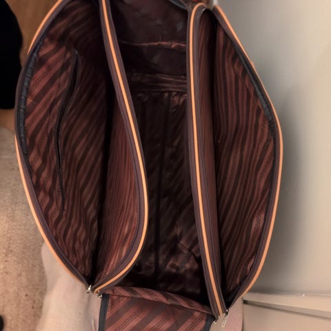 Den ena är Carin Wester väska tillverkad i fuskläder. Designad för unisex-användning. Väskan har ett mönstrat yttre och en dragkedja för stängning. Invändigt finns flera fack för förvaring. Den andra är från Lindex. 149 kr för både