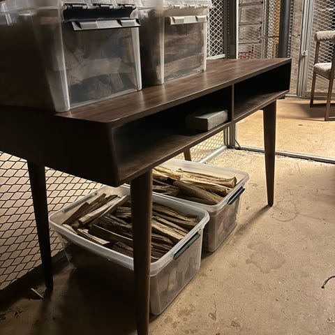 Vi har haft bordet i vår dotters rum, varför fronten på bordskivan är något kantstött på grund av stolen. I övrigt är allt i perfekt skick.