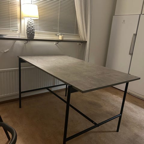 Bordet har blivit skavt på ena sidan går säkert att fixa på något sätt. Bordet har pulverlackade metallben och en toppskiva i folierad MDF.