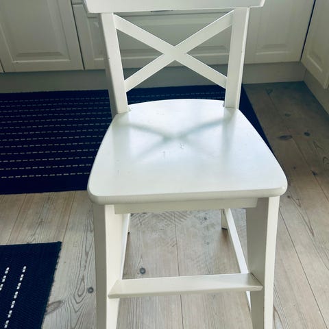 IKEA barnstolar i vitt trä, designade för barn. Stolarna har en korsrygg och en sitthöjd anpassad för barn. Passar som sittmöbler i barnrum eller vid barnbord.