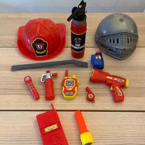 Säljer ett Badge City Hero polis/ räddnings-set i blått, komplett med hjälm med visir och ljus, handbojor, walkie‑talkie, solglasögon och bricka. Samt även glasögon som gör att man kan se bakåt.